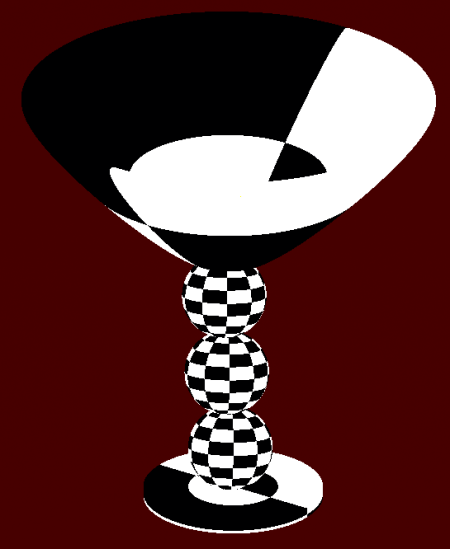 As with maps, there are several ways to do the mapping and none of them is necessarily better. In BRL-CAD the mapping is done automatically by the shader system. An existing shader is that of the “chessboard” texture. I rendered the image of the cup with this shader: