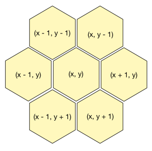 In a hexagonal grid, if we have the piece p1 in position \((x,y)\), it will be adjacent to another piece p2 if and only if p2 is in one of these six positions: 1: \((x-1, y)\), 2: \((x+1, y)\), 3: \((x-1, y-1)\), 4: \((x, y-1)\), 5: \((x-1, y+1)\) or 6: \((x, y+1)\). We can define two adjacency categories: Type I, which happens when \(p1.y - p2.y = 0\) and \(\mid p1.x - p2.x \mid = 1\) (cases 1 and 2); and Type II, which is when \(\mid p1.y - p2.y \mid = 1\) and \(p1.x - p2.x \le 0\) (cases 3, 4, 5 and 6).