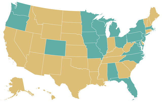 We also generate the map with the states where A gets $\lfloor v/2 \rfloor + 1$ votes in gold and 0 votes in green:
